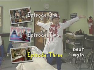 Into the menus, then. They're actually quite nicely designed: a lovely montage of clips from the show, along with the passport photos from the credits (which keep changing, obviously). Unfortunately, the effect is rather spoilt by the rather ugly comic-sans-alike font used for the text. I can see what they were trying to do (echo the series logo), but it just doesn't work; it makes the thing look slightly cheap, in the wrong way. Full marks for using the correct logo, mind you.